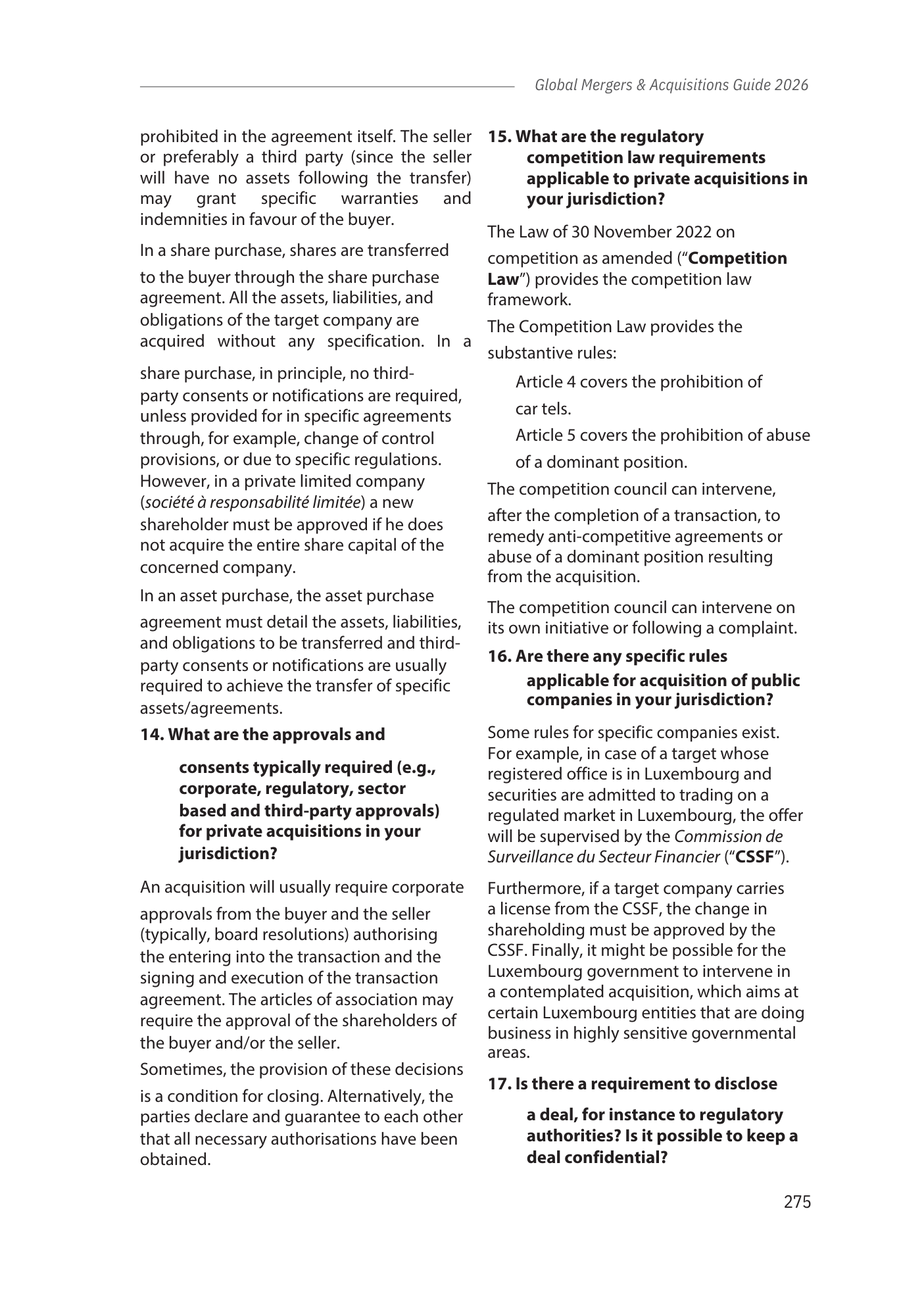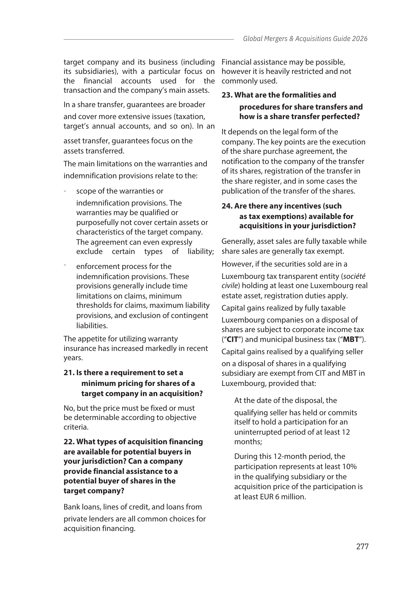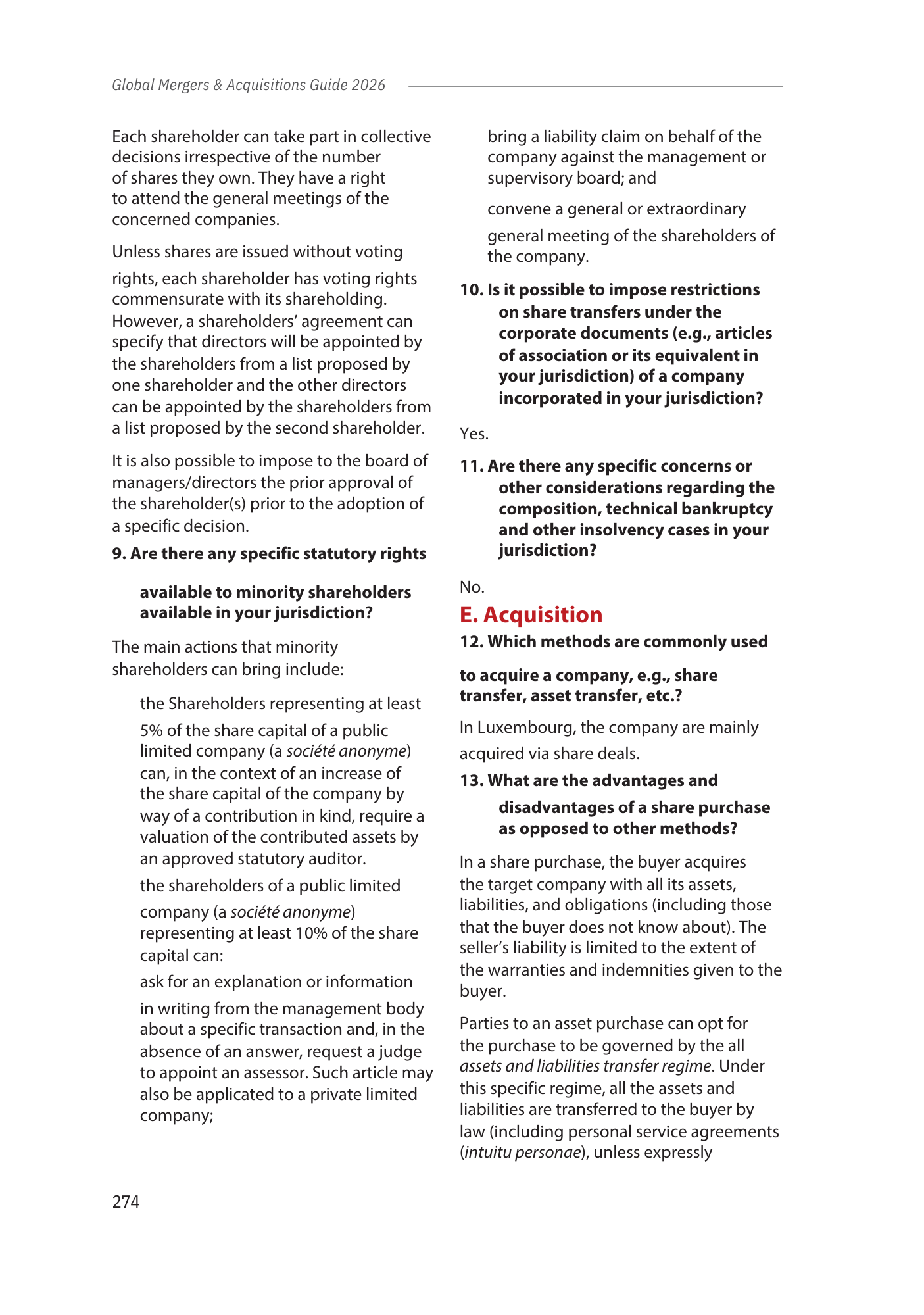 This chapter provides an overview of the Luxembourg legal framework for M&A transactions, covering in particular: