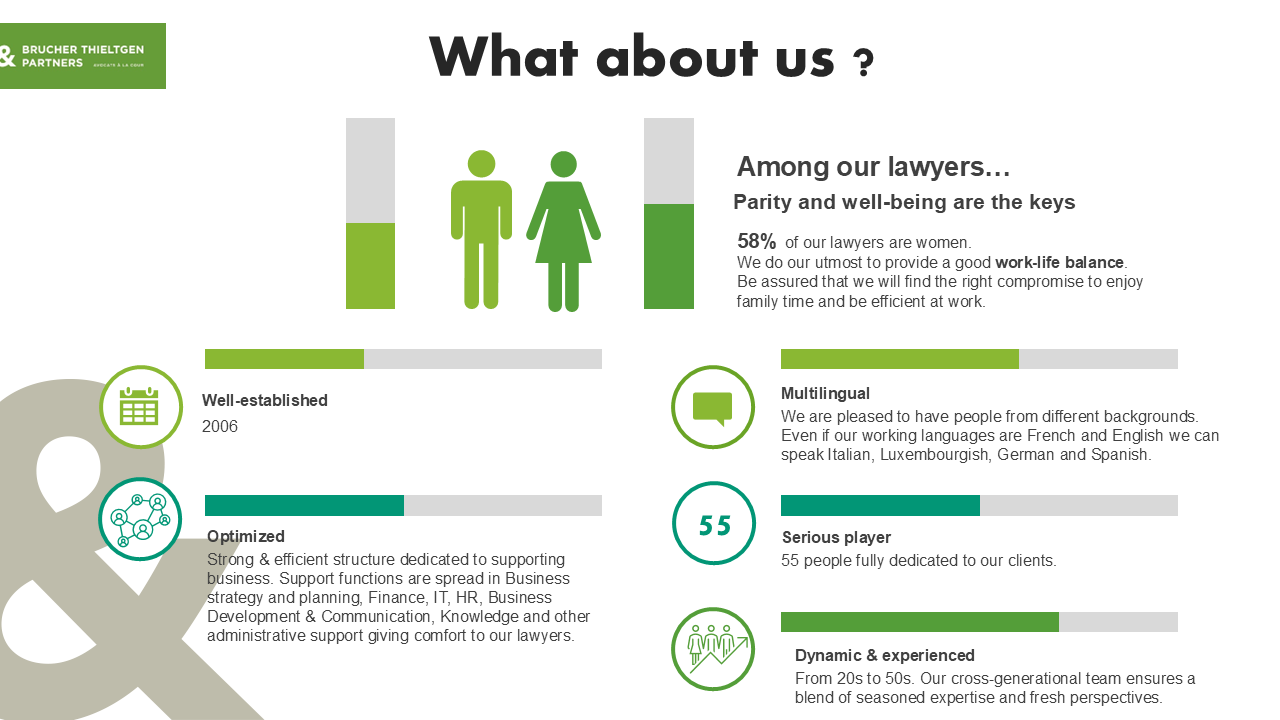 Brucher, Thieltgen & Partners, a legal practice established in Luxembourg City at the heart of the international financial center, is a multidisciplinary firm active in the field of business law.