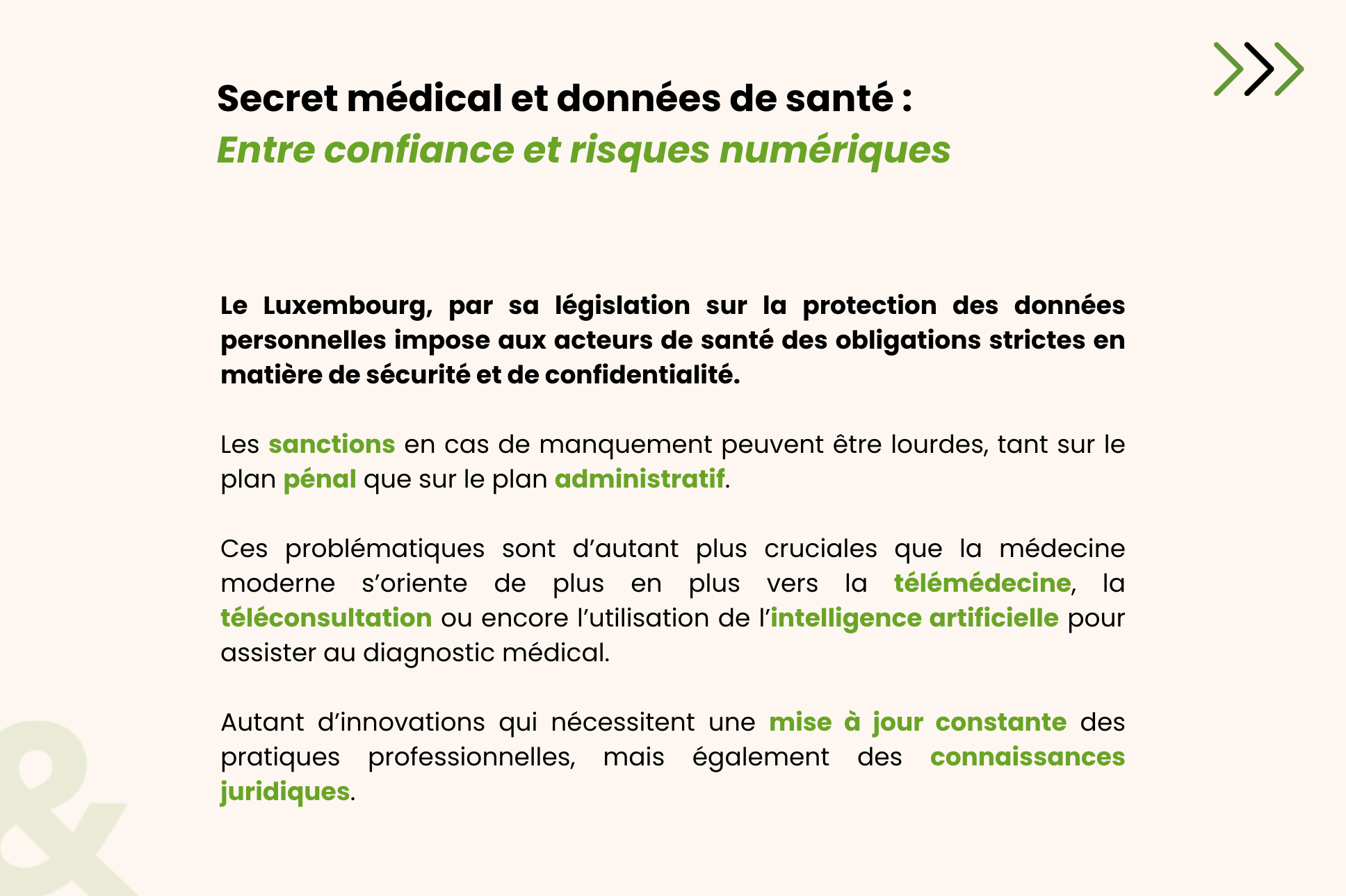 Le droit médical au Luxembourg est un domaine en perpétuelle évolution, à la croisée du droit, de la médecine et de l’éthique. Il s’appuie sur des principes fondamentaux comme le consentement éclairé mais aussi la responsabilité professionnelle et la protection des données. Face à la technicité croissante et à l’émergence de nouveaux risques, il devient indispensable de rester informé et formé.