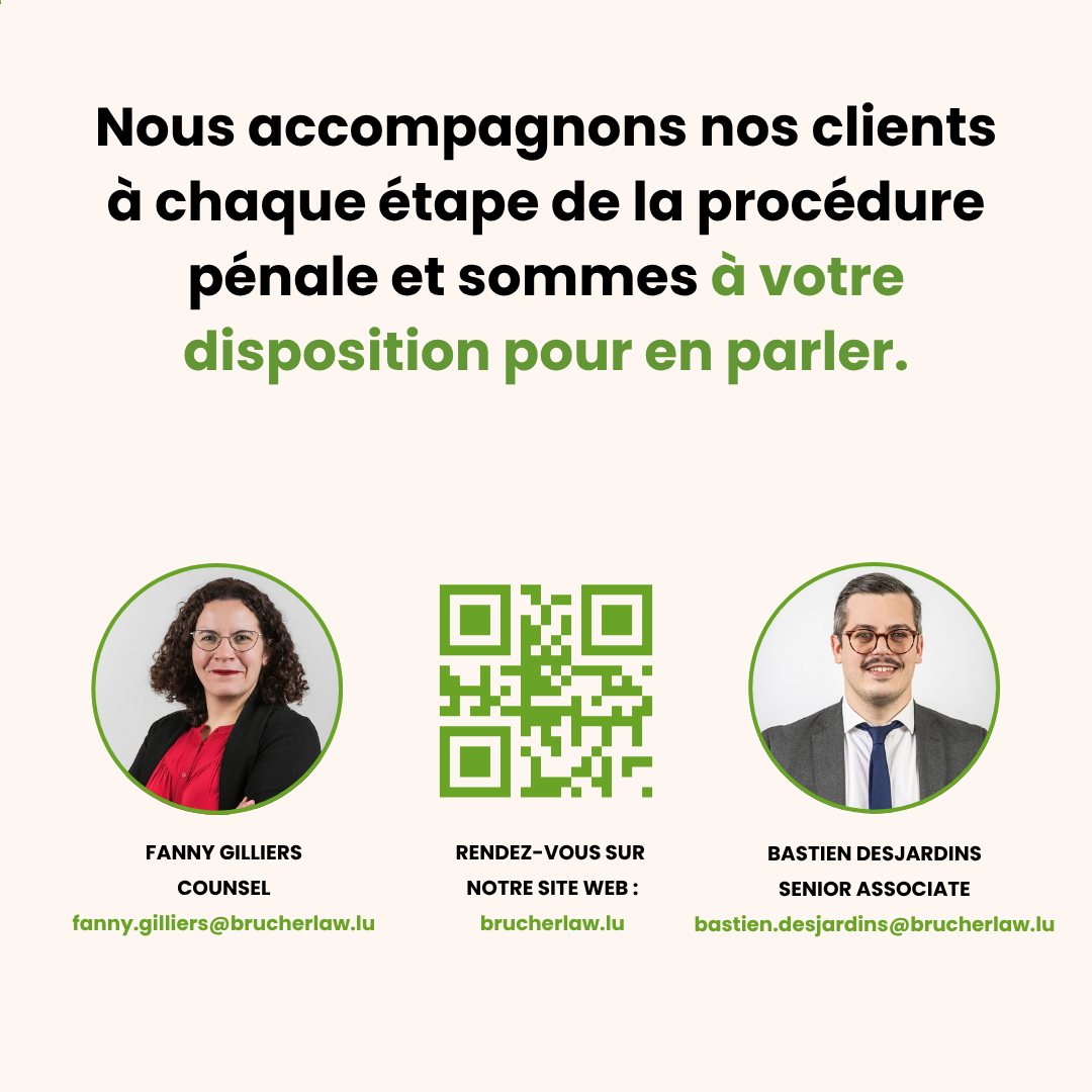 ➡️ Pour toute question en matière pénale, contactez Fanny (fanny.gilliers@brucherlaw.lu) et Bastien (bastien.desjardins@brucherlaw.lu)