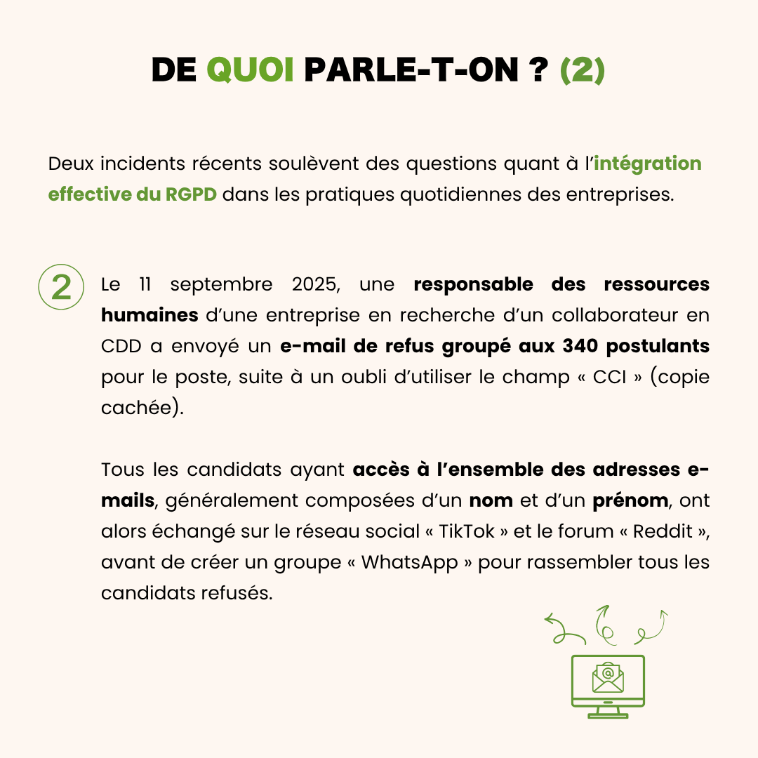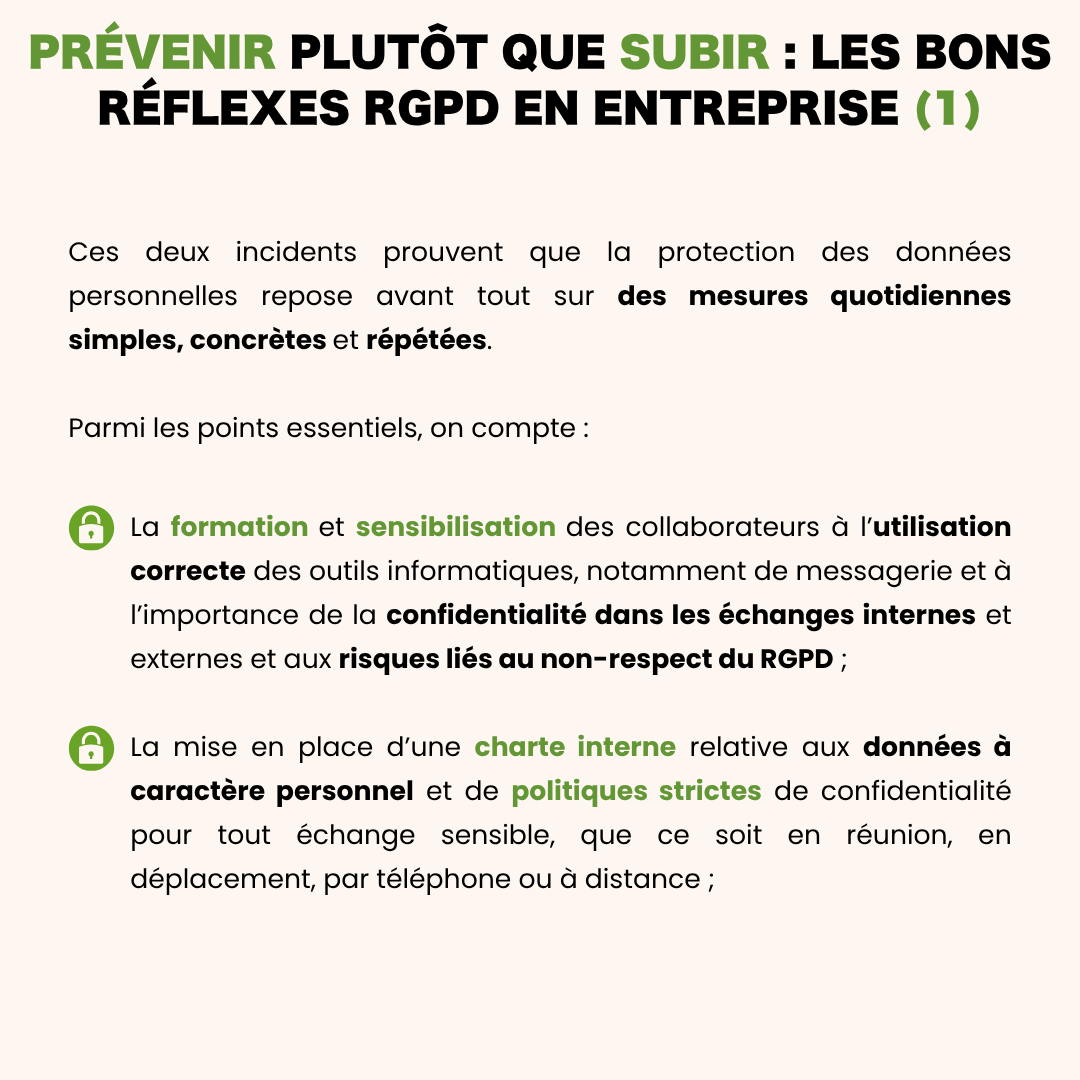 Deux erreurs banales. Mais derrière ces maladresses humaines se cache une réalité : des données personnelles exposées et des obligations RGPD violées. Ces deux affaires montrent que le RGPD n’est pas qu’une contrainte juridique, mais un véritable enjeu quotidien de confiance, d’image et de sécurité pour l’entreprise 🏢